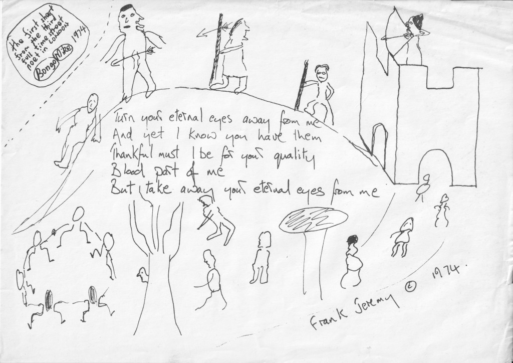 I reproduce here the first street poem I published and sold on the streets, after being encouraged by Bongo Mike to join him, using the artist name Frank Jeremy. And when some time later I took up playing the guitar again, performing as a duo with Mike, I was renamed Extremely Frank Jeremy