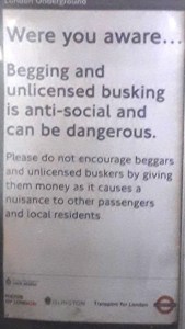 This poster which appeared in a subway near to Old Street tube station, in London, some time after the advent of the licensing philosophy, tells its own story. Added to which, a prosecution mounted as late as 2009 against London busker Bernard Pierre, which attracted some interest from the press, threatened to give this dangerous idea some legal validity.